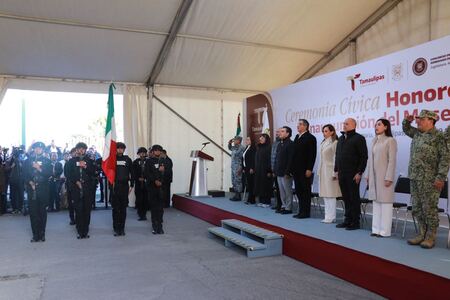 | En un marco de respeto, unidad institucional y fortalecimiento de los valores cívicos, las y los diputados locales, así como servidoras y servidores públicos del Congreso del Estado, realizaron la ceremonia cívica de honores a la Bandera Nacional y al Escudo de Armas de Tamaulipas, en presencia del Gobernador Américo Villarreal Anaya y su gabinete, así como el pleno del Poder Judicial encabezado por la Magistrada Tania Contreras. La ceremonia tuvo lugar en el recinto legislativo, la Casa del Pueblo, y refrendó el respeto y amor a los símbolos patrios, así como el compromiso de los poderes públicos del Estado con la historia, la identidad y el bienestar del pueblo tamaulipeco. Al dar la bienvenida, el presidente de la Junta de Gobierno del Congreso del Estado, diputado Humberto Armando Prieto Herrera, expresó el orgullo de esta Soberanía por recibir al titular del Poder Ejecutivo y del Poder Judicial, subrayando que es una clara muestra de respeto, coordinación y cercanía entre poderes. “Somos poderes distintos, pero no distantes. La unidad que hoy se manifiesta aquí es por el bienestar de nuestro pueblo”, afirmó el legislador, al reconocer la conducción del Gobernador y el rumbo claro que ha tomado Tamaulipas, con un enfoque humanista y centrado en la gente. Durante su mensaje, el diputado Prieto Herrera resaltó el trabajo legislativo desarrollado en coordinación con el Ejecutivo, haciendo énfasis en reformas de gran calado, como la transformación histórica del Poder Judicial, que hoy es más cercano a la ciudadanía, así como en el intenso trabajo del Congreso, cuyo reciente récord ahí repasó: Ha resuelto 556 asuntos en definitiva, en materias clave como justicia, educación, igualdad, salud, seguridad, desarrollo sustentable, transparencia, cultura y bienestar social, alineados con la Agenda 2030 de Naciones Unidas; ha celebrado 44 reuniones de comisiones y 27 sesiones legislativas en el periodo reciente. El Presidente de la Junta de Gobierno también informó sobre los reconocimientos nacionales obtenidos por el desempeño legislativo de esta Legislatura 66, que colocan a Tamaulipas entre los congresos mejor evaluados del país. “Puedo decir con toda claridad, que estamos trabajando, seguiremos trabajando y vamos a continuar poniendo por delante a la gente. ¡Tamaulipas tiene un Congreso dentro de los primeros lugares del País!”, resaltó. En su oportunidad, el Gobernador Américo Villarreal Anaya expresó su satisfacción por participar nuevamente en este acto cívico en el Congreso del Estado, destacando la unidad de trabajo entre los tres Poderes. El mandatario estatal reconoció la labor del Legislativo y su contribución a la regeneración de la vida pública del estado ,mediante un marco jurídico sólido que fortalece la democracia, la justicia, la paz y la prosperidad. Subrayó que una de las grandes fortalezas del Tamaulipas actual es la decisión de acercarse a la gente, ampliar el diálogo y gobernar de cara a la ciudadanía. En su mensaje, el Gobernador reconoció de manera especial el papel del Congreso en la aprobación de reformas clave, como la creación de la Guardia Estatal, el fortalecimiento de la Fiscalía General de Justicia y la histórica reforma al Poder Judicial. Finalmente, Villarreal Anaya llamó a mantener la unidad, el diálogo y el compromiso ético con el pueblo de Tamaulipas, reiterando que los avances logrados son resultado del trabajo conjunto entre poderes y de una visión compartida de transformación, justicia social y bienestar. “Celebramos también la unidad que existe en nuestro estado, al coincidir en este acto la representación de los tres poderes, quienes servimos al pueblo de Tamaulipas con la misma entrega y determinación, para que la transformación que nos propusimos continúe entregando resultados positivos”, señaló. En el acto estuvieron presentes autoridades civiles y militares, integrantes del gabinete estatal, representantes del Poder Judicial, legisladores federales y locales, así como personal del Congreso. | |