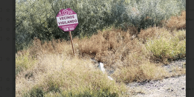 Los anuncios colocados en lotes baldíos, destacan “Vecinos Vigilando”, además de que observan en el aviso una cámara fotográfica, en una advertencia entendida de que mediante imágenes pueden ser denunciados.