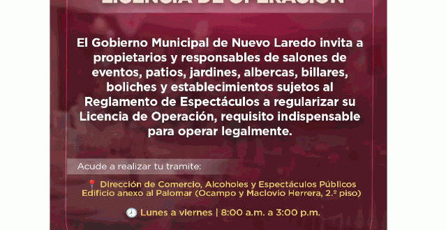 El Gobierno Municipal de Nuevo Laredo hace un atento llamado a las y los propietarios, representantes legales y responsables de salones de eventos, patios, jardines, albercas, billares y boliches, así como de establecimientos y eventos sujetos al Reglamento de Espectáculos, a tramitar o renovar su Licencia de Operación vigente, requisito indispensable para operar de manera legal dentro del municipio.
