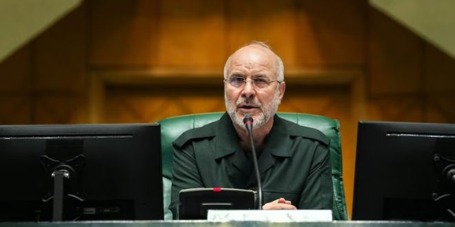 El presidente del Parlamento iraní, Mohamed Bagher Ghalifab, vestido con el uniforme del Cuerpo de la Guardia Revolucionaria Islámica (CGRI), asiste a una sesión del parlamento en Teherán. Europa Press/Contacto/Icana