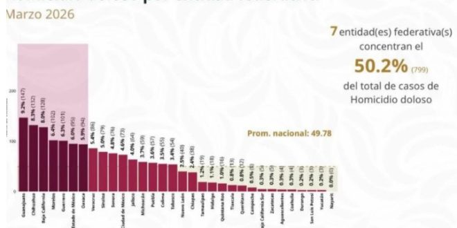 A nivel nacional, más del 50% de homicidios dolosos se concentran en siete estados del país, con un total de 799 casos: Guanajuato, Chihuahua, Baja California, Morelos, Guerrero, Estado de México y Oaxaca, de acuerdo con los datos presentados en la conferencia matutina del 14 de abril de la presidenta Claudia Sheinbaum.