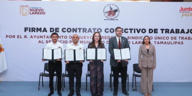 En un acto que refuerza el compromiso con la base trabajadora del municipio, la presidenta municipal, Carmen Lilia Canturosas Villarreal, encabezó la firma del Contrato Colectivo de Trabajo con el Sindicato Único de Trabajadores al Servicio del Municipio de Nuevo Laredo, consolidando mejoras significativas en las condiciones laborales y el bienestar de las y los empleados municipales.