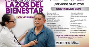 Febrero 25 de 2026 Ciudad Victoria, Tamaulipas.- El Gobierno del Estado y el Sistema DIF Tamaulipas, presidido por la doctora María de Villarreal, invitan a las familias victorenses al Segundo Corredor de la Salud “Lazos del Bienestar”, que se llevará a cabo el jueves 26 de febrero, a partir de las 9:00 de la mañana, en el campo de fútbol …