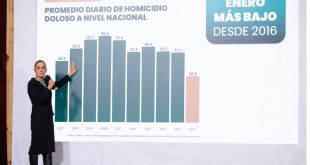 10 febrero, 2026 La presidenta Claudia Sheinbaum Pardo informó la baja de 42 por ciento en homicidio doloso entre septiembre 2024 y enero 2026, lo que significa que hoy se cometen 36 de estos delitos menos al día en México. Luego de explicar que dichos indicadores consideran la reducción adicional de dos por ciento en los últimos dos meses, añadió que este 2026 registró …